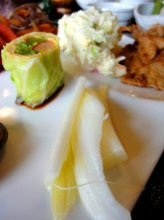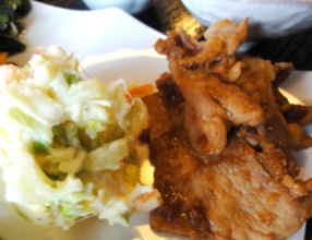 メニュー:豚肉のつけ焼き、ポテトサラダ、スナップエンドウとカニカマのキャベツ巻き、