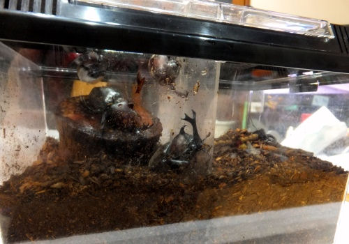 カブトムシは夜になるとワサワサと ”おしくらまんじゅう” をしているけど怪我はないようです。