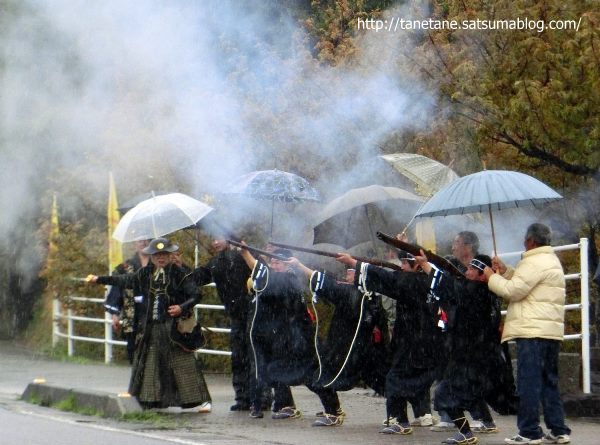 ハーフマラソンスタート地点では「中種子火縄銃保存会種子島鉄砲隊」が初陣を飾りました。