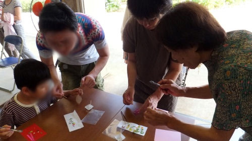 その後、参加者全員で押し花作り。しおりとハガキに先生が準備して下さった