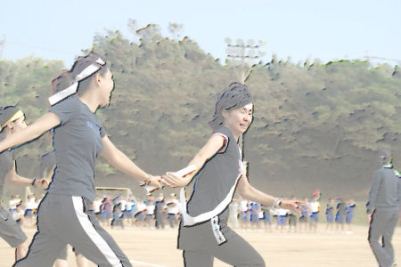 さあ、お待ちかねの職場対抗リレーです。職場が分かるような格好で爆笑の爆走!!