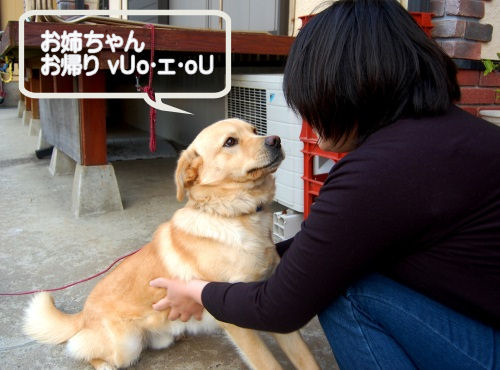 お昼ご飯を食べに帰って来たお父さんを見て、「ゴワン、ゴワン!お腹が空いたよ~!!」って