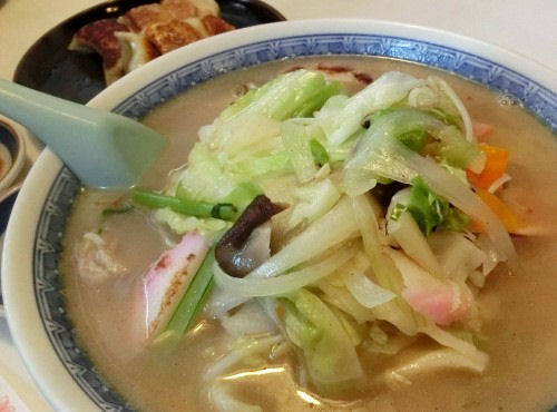 主人は定番の炒飯と塩ラーメン。私はたっぷり野菜のチャンポンと餃子。