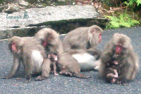 おまけにお猿さんの親子 夕方に下山する観光客を道路に出て待っているようです。
