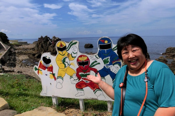まずは中種子の観光地「雄龍雌龍の岩」でご当地ヒーロー”タネガシマン”と記念撮影