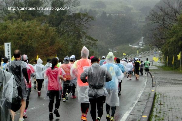 生憎の雨の中、銃声を合図に元気よく走り出す選手たち。無事完走できることを祈ってます。