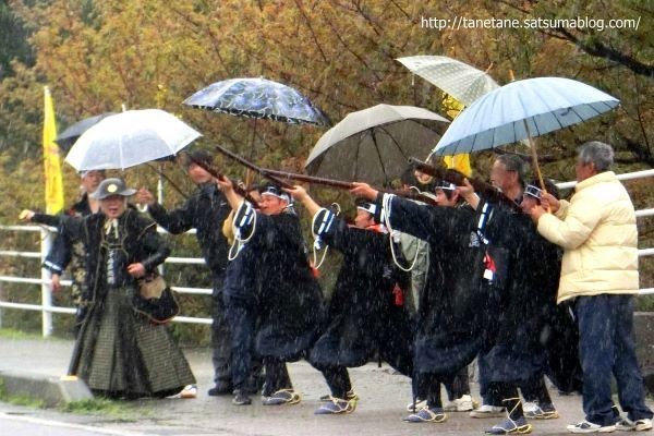 ハーフマラソンスタート地点では「中種子火縄銃保存会種子島鉄砲隊」が初陣を飾りました。