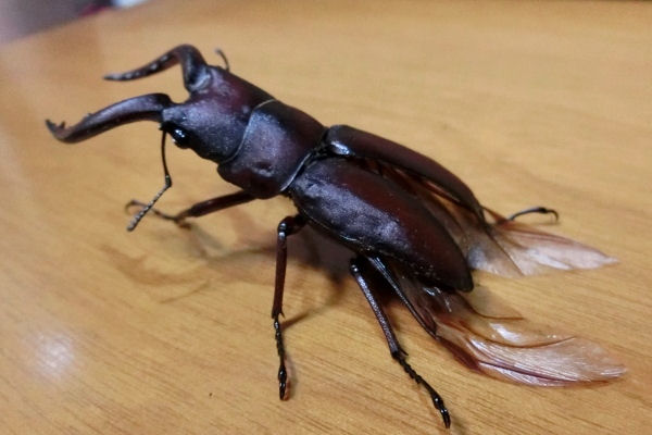 小さなクワガタは、表面に傷ができ、薄い翅をしまうことができません。