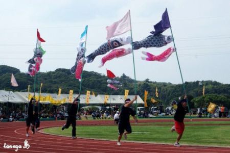 風の影響をもろに受ける鯉のぼり。竿を立てて走るのがルールだからキッツーイ!