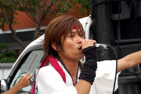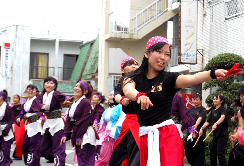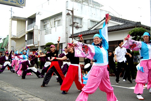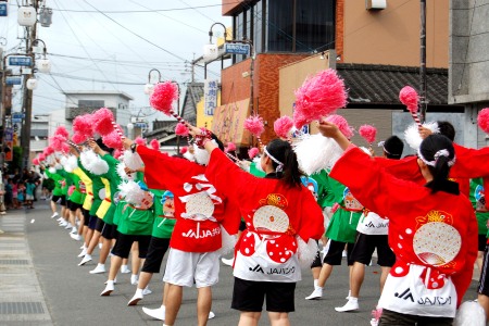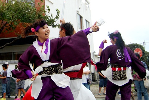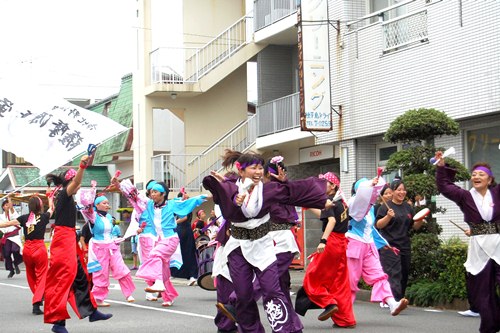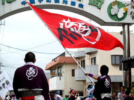 紫の衣装の背中には”あばれん”の文字 赤い団旗がかっこいい