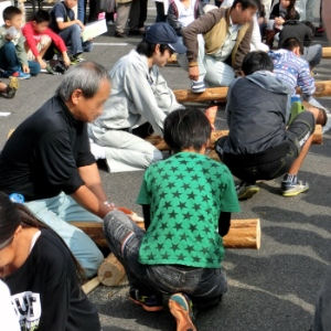 種子島森林組合ブース前で始まった「丸太切り」