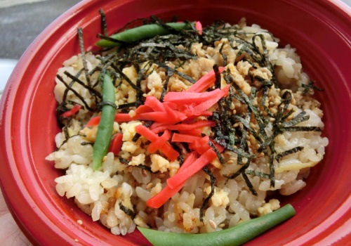 炊き込んだご飯に、鶏そぼろ、紅ショウガ、季節の野菜をトッピング