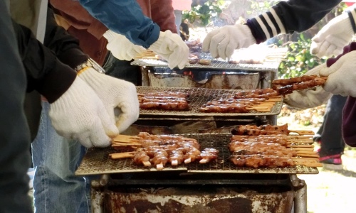 PTAのみなさんは鶏串をセッセと焼いて保温ケースに入れ、販売準備をしています。