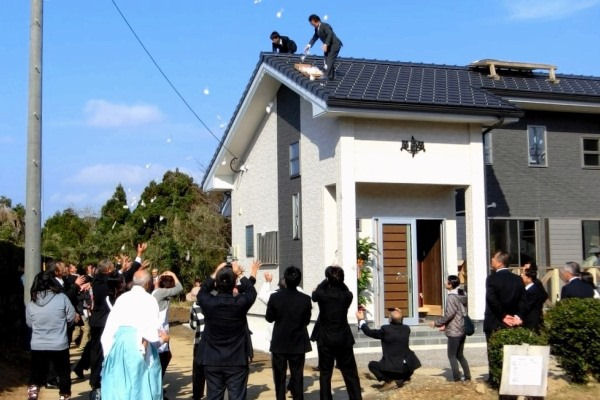 棟梁とお施主さんは屋根に上ってお祓いと餅まきの準備。