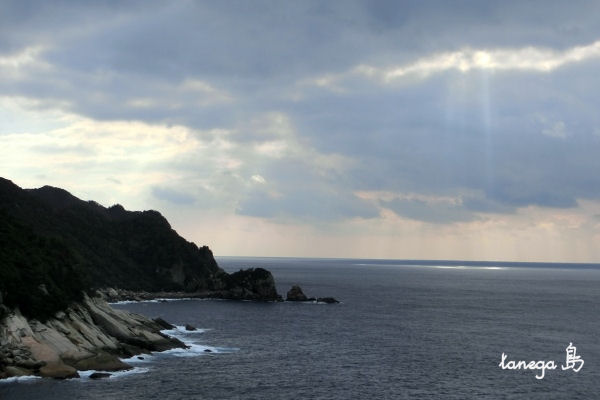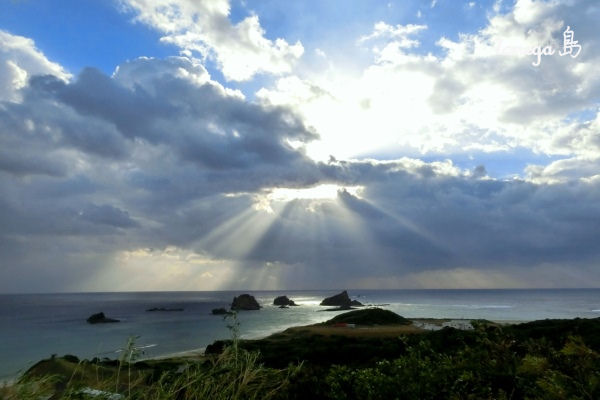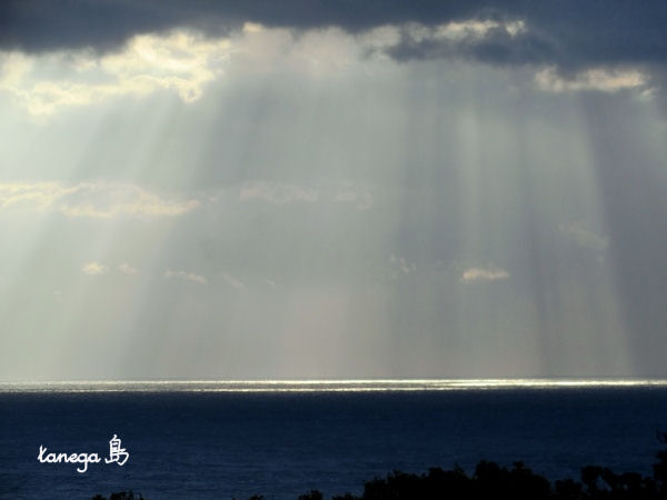 厚い雲の隙間から海に向かって閃光が降りていました。 天使の梯子がいっぱい(^o^)丿