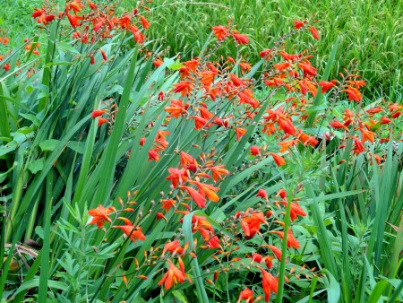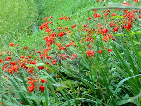 畦道を散歩する。姫檜扇水仙(モントブレチア)も華やかに咲いていた。