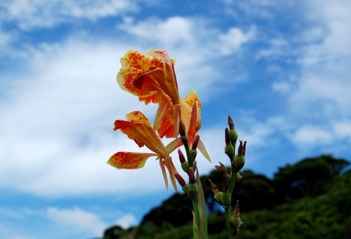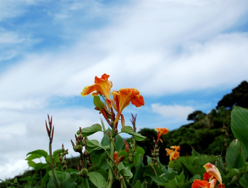 海岸沿いにカンナが咲いている