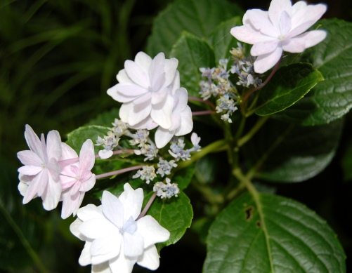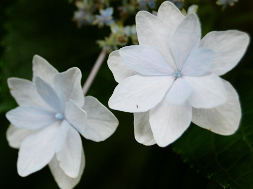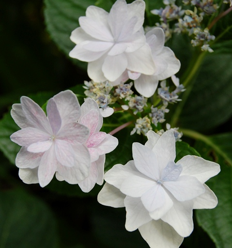 お宅には奥様ご自慢の「純ちゃんのヒミツのお庭♪」があり、一番の花盛りは終わったものの、額紫陽花が白い小さな花をつけていました。