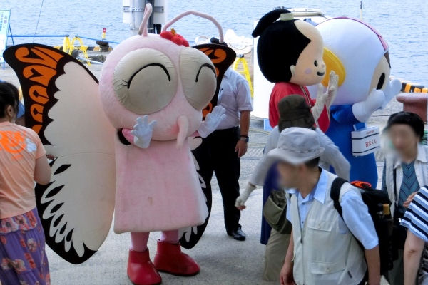 3市町のキャラクターもお出迎え 帰省の人達を迎えるイベントが開催されていたようです。