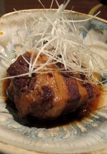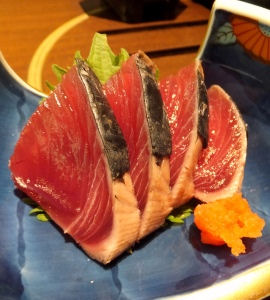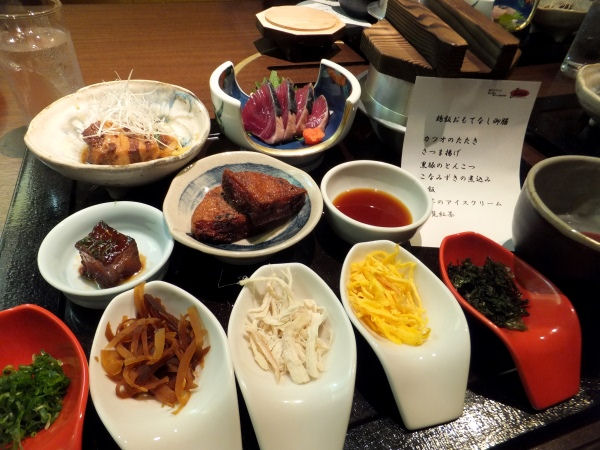 カツオのたたき、さつま揚げ、きびなごの唐揚げ、こなみずきの煮込み、黒豚とんこつ、
