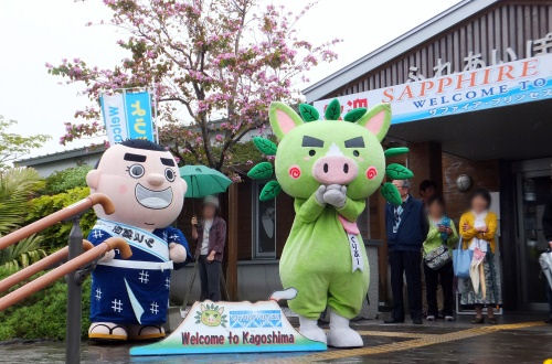 鹿児島のキャラクター「ぐりぶー」と「西郷どん」がお出迎え
