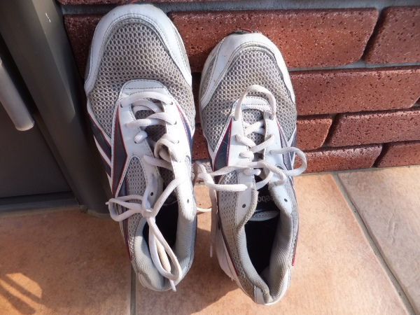 昨日の大雨で濡れた靴を誰かが干しています。