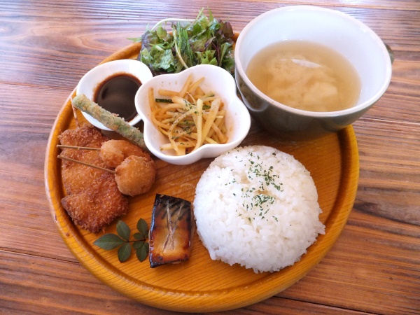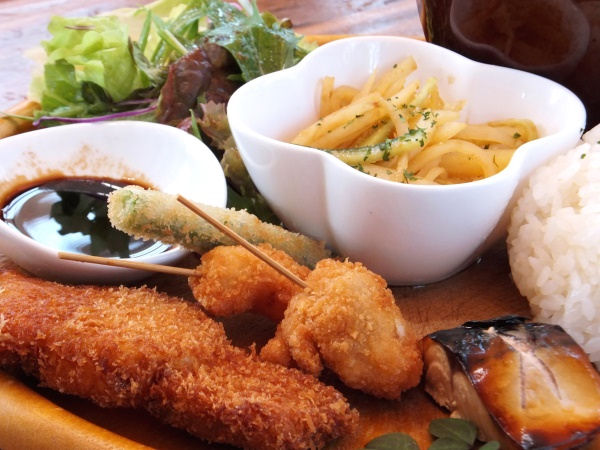 私が娘達と訪れたこの日のランチメニューはサバの幽庵焼き、串揚げ、じゃが芋の和え物