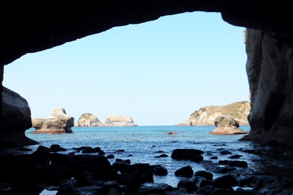 南種子町には干潮時だけ入れる広い岩屋がある。岩屋の中から見る種子島の海と空は、、、青!