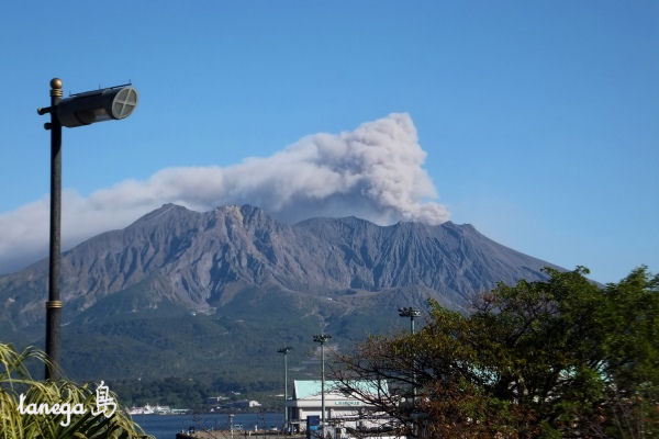 手前には温泉の湯けむり。遠くには桜島の噴煙。モクモクモクモク・・・