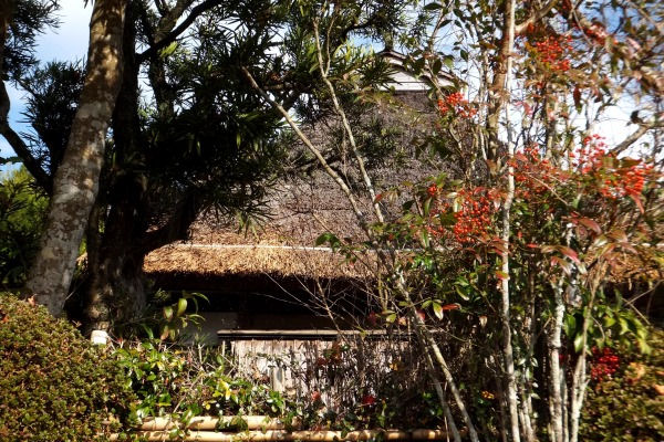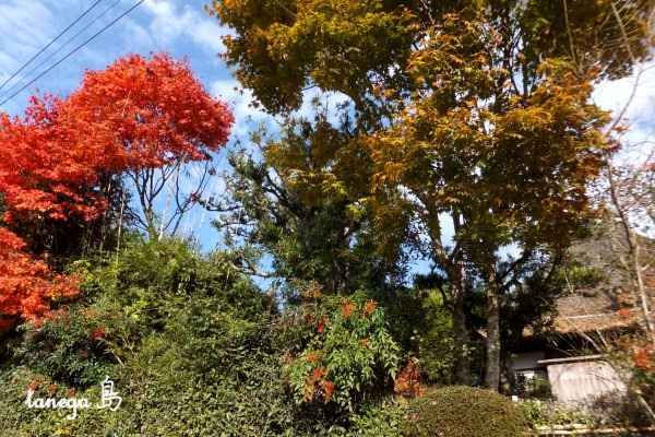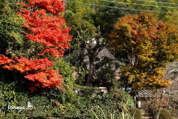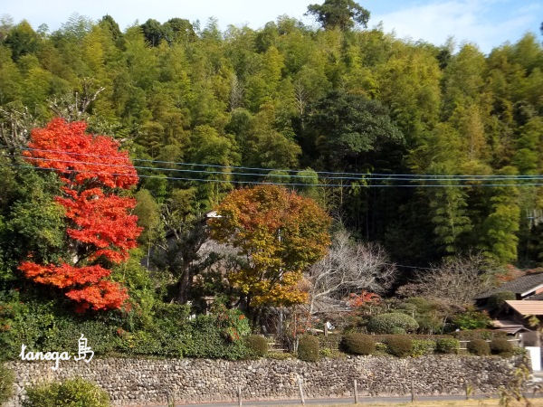 竹林の緑とモミジの赤、銀杏の黄色が街道を彩る。