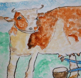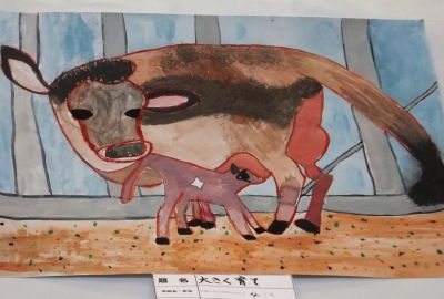 私が気に入った2点。 左の絵(小学4年生)は母牛の愛情が感じられ、