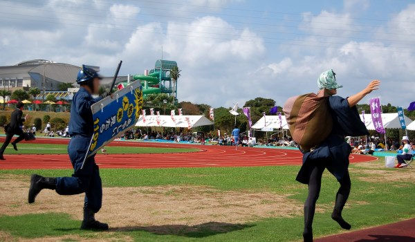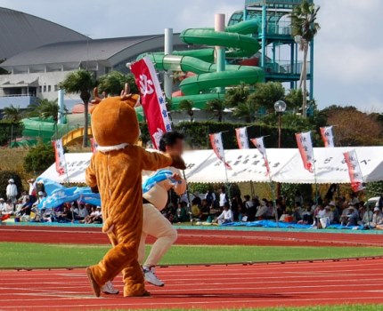 着ぐるみが走ったり、おまわりさんがドロボーを追っかけたり・・・職場対抗リレーは楽しい!