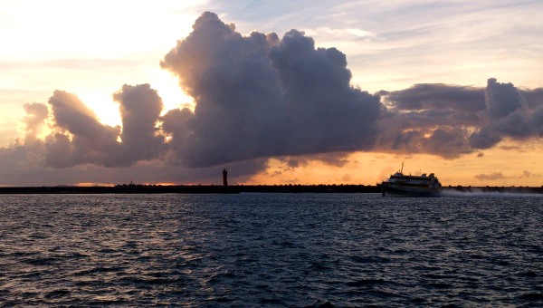 今日の空倶楽部は息子がスマホで撮った「西之表港の夕景と高速船トッピー」