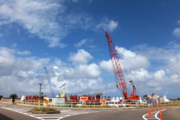 西之表港でテトラポット製造作業中のクレーン