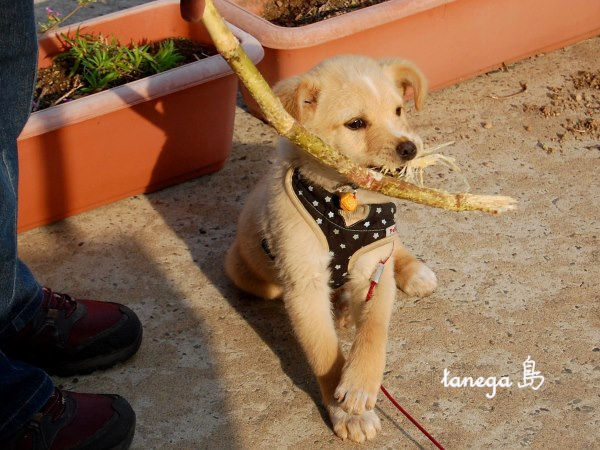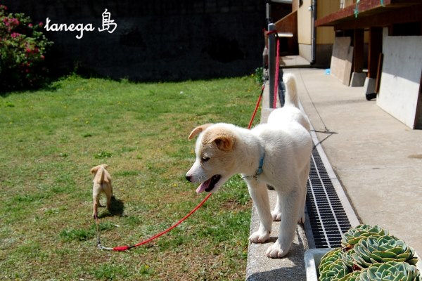 結局丁度いいサイズのハーネスが無くて断念。シロは僕のリードを付けてやってきました。