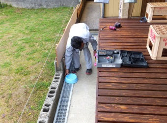 お母さんは犬小屋に入るようにお菓子を犬小屋に撒いたけど、僕、ウッドデッキの下がいいよ。