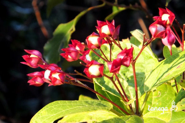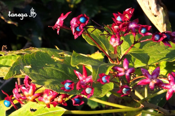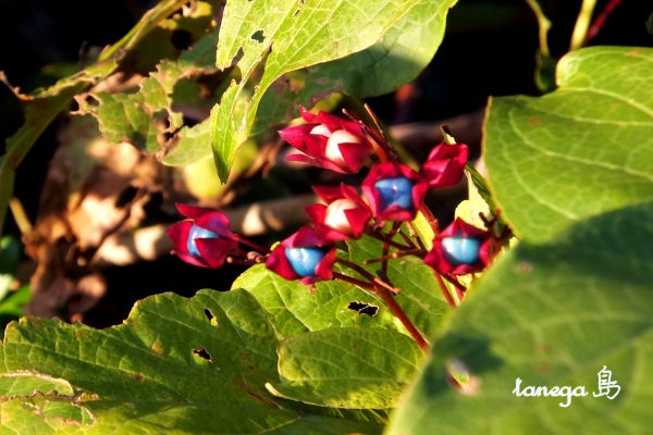 かわいい花が咲き、やがて赤いガクの中から青い実が生る